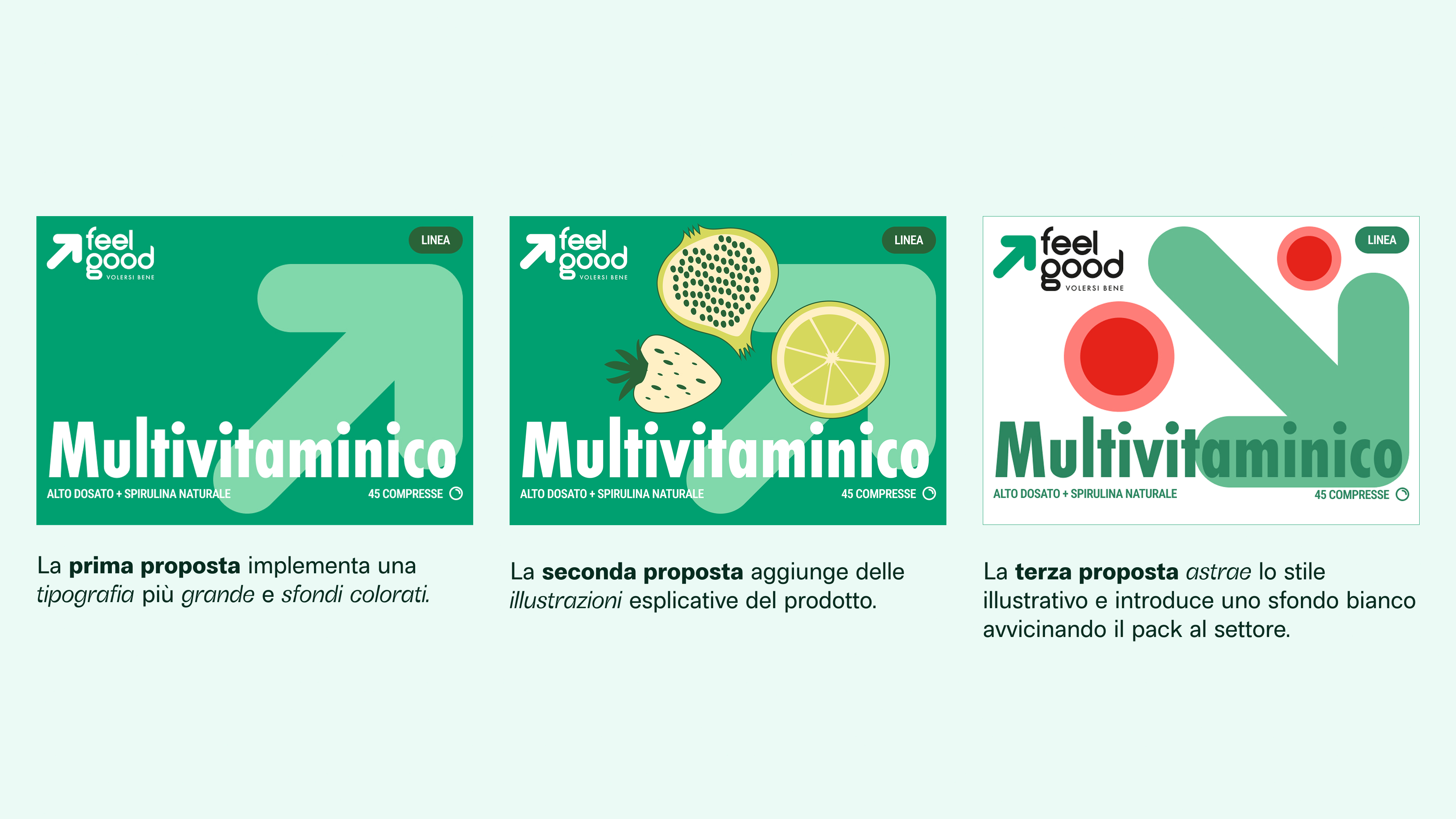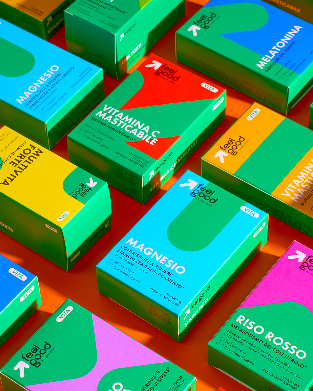 Nel 2024 durante il corso di packaging design abbiamo collaborato con studio Quindici e Feelgood per la realizzazione di un pack di nuovi integratori alimentari, ora in commercio. L’obiettivo era sviluppare un design innovativo, il quale si differenziasse dalla massa dei prodotti farmaceutici nelle grandi catene di distribuzione.