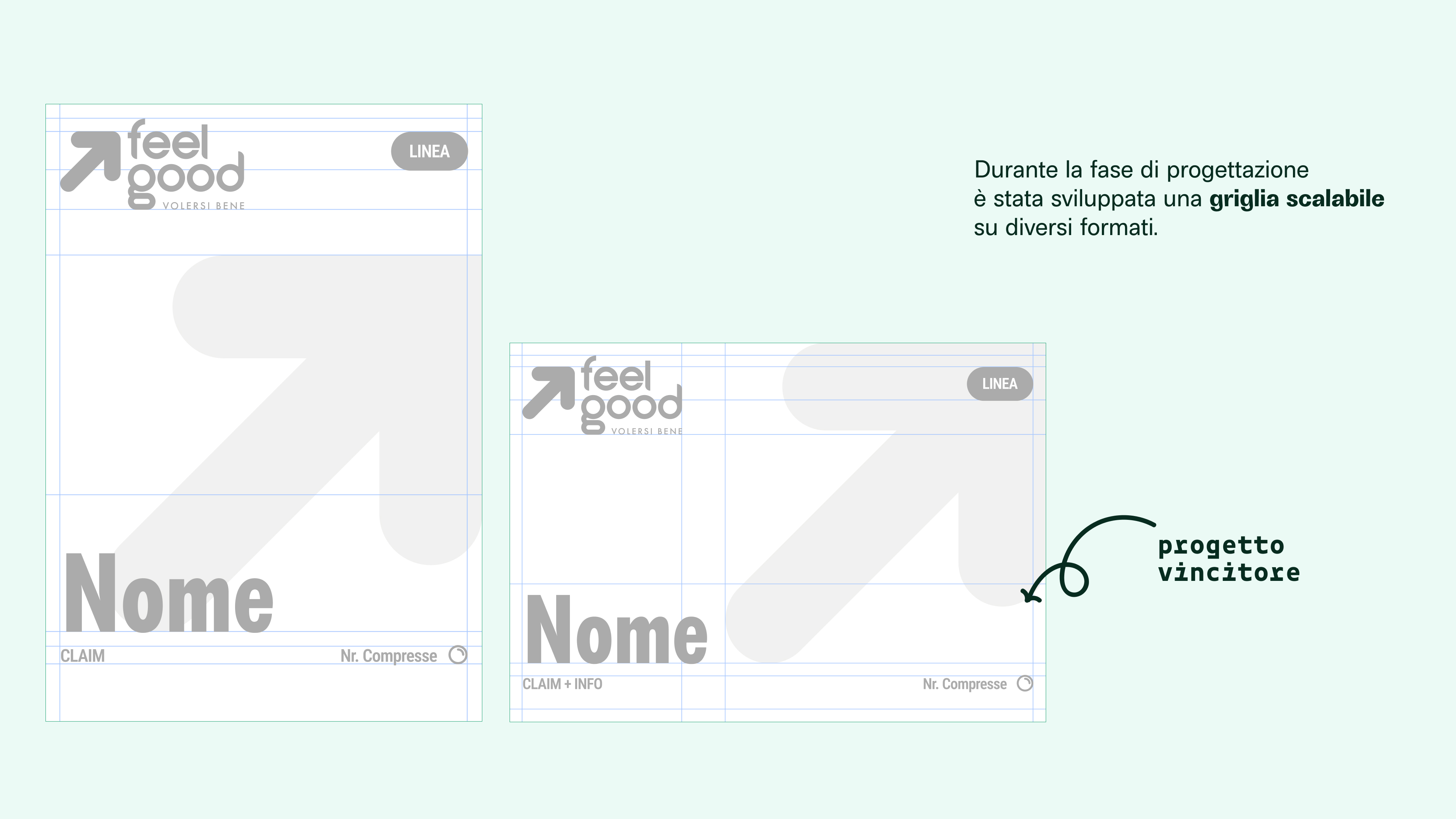 Il progetto sintetizza le fasi precedenti in un layout essenziale e riconoscibile, supportato da una griglia modulare e scalabile, pensata per adattarsi a diversi formati e declinazioni di linea. Il risultato è un sistema coerente, flessibile e facilmente applicabile, capace di comunicare in modo chiaro e contemporaneo l’identità del brand.