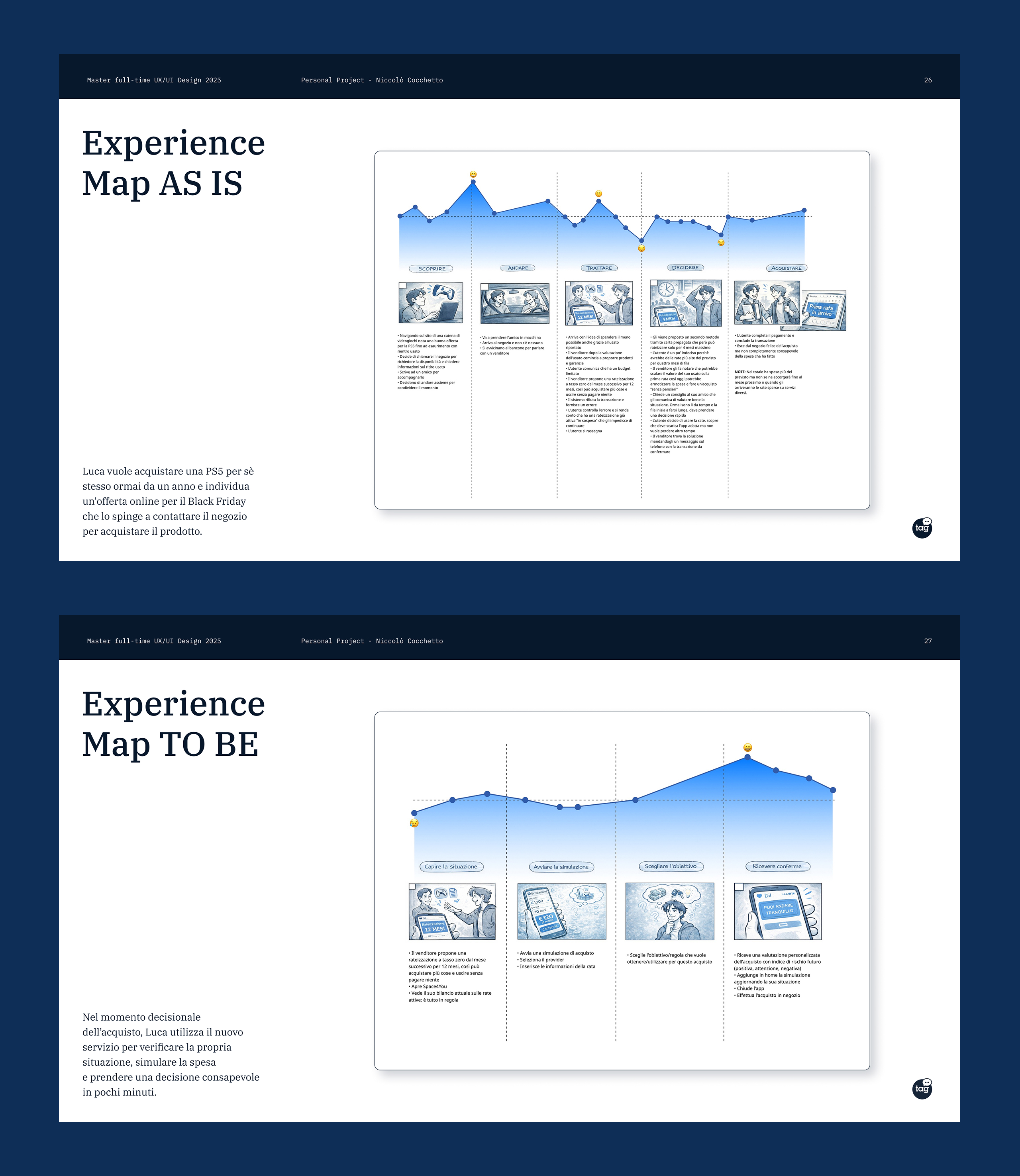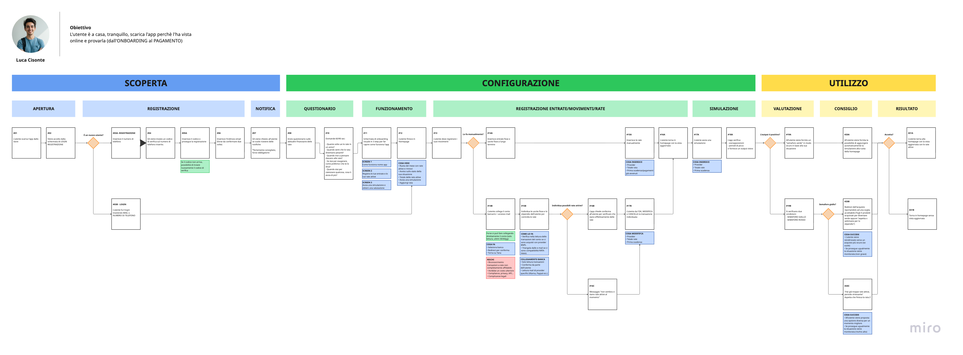 Successivamente ho mappato l’esperienza ipotetica di un utente che acquista un prodotto in negozio tramite il servizio Buy Now, Pay Later, con l’obiettivo di individuare i principali punti di attrito e sviluppare una possibile esperienza futura.