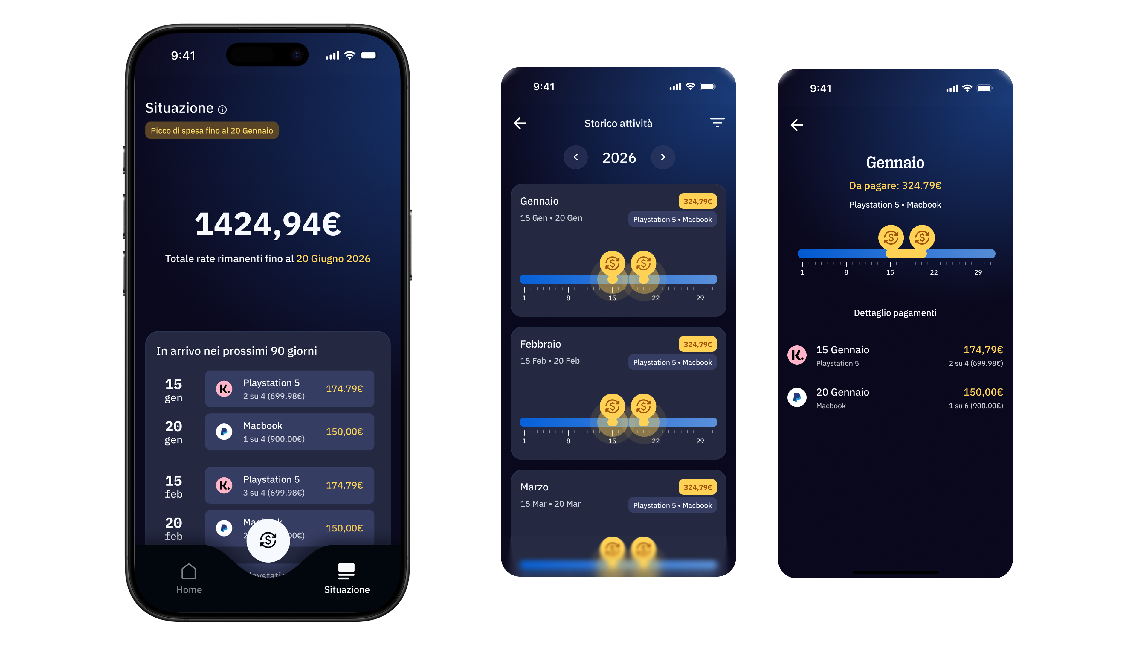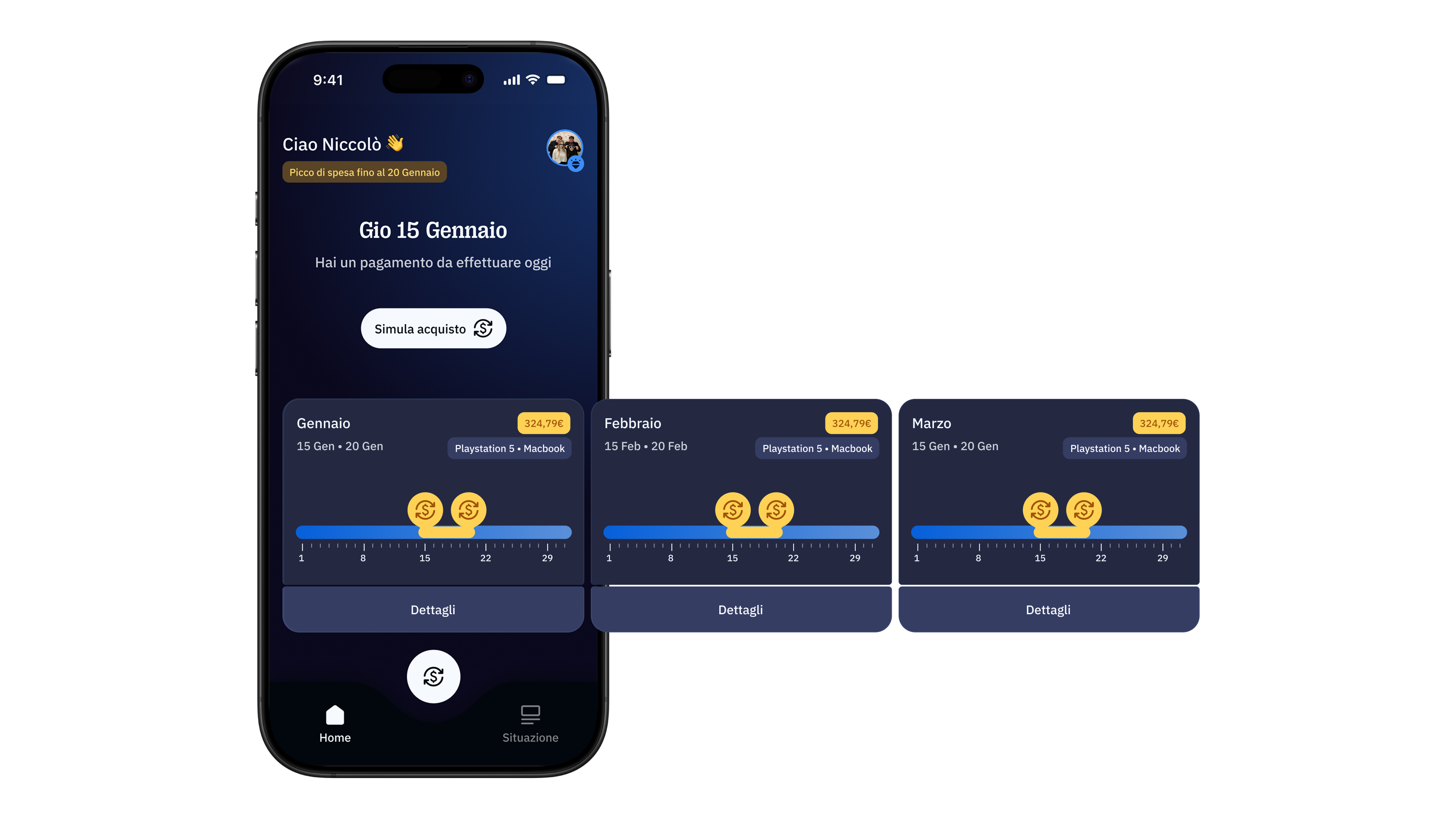 La home offre una panoramica sui prossimi pagamenti a rate e sulla situazione di spesa complessiva dell’utente. Le principali funzionalità di questa sezione includono una timeline mensile delle rate, che consente di visualizzare tutte le informazioni sui pagamenti futuri fino a 90 giorni, e un accesso diretto alla simulazione di acquisto, utile per ottenere una visione chiara della spesa prevista.