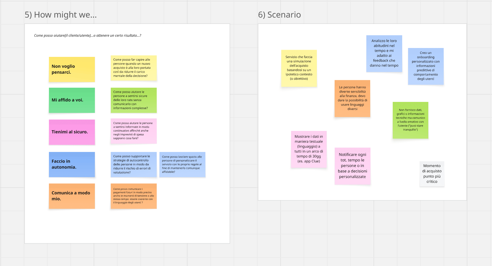 Attraverso la tecnica degli How Might We e l’elaborazione di scenari ho esplorato un’ampia gamma di idee, con l’obiettivo di divergere il più possibile e visualizzare soluzioni ideali su cui avviare la fase di progettazione.