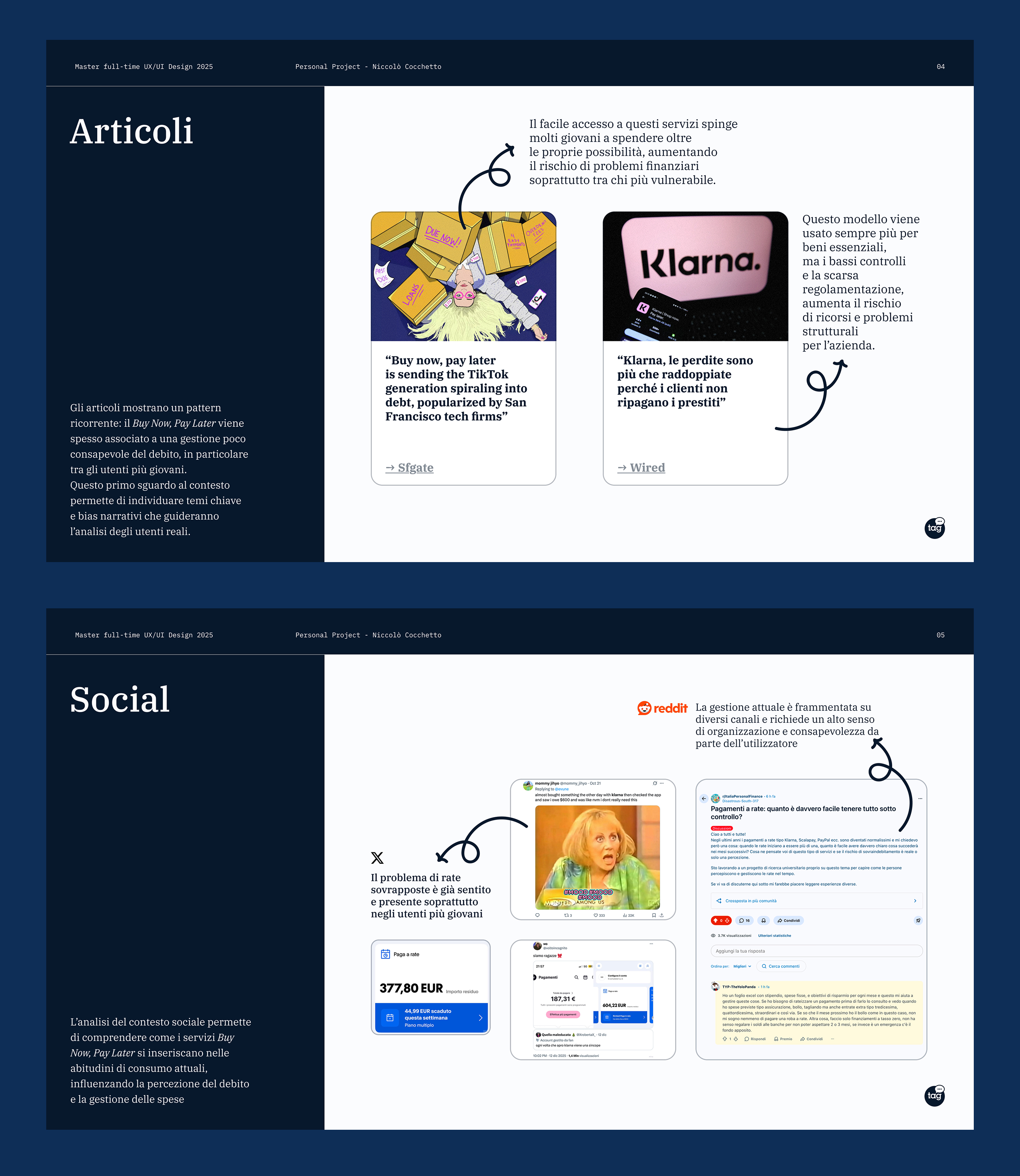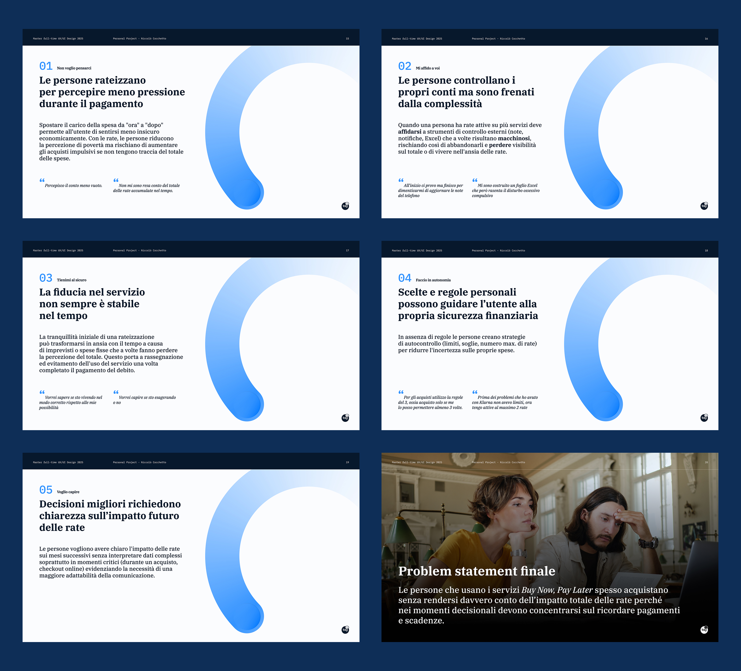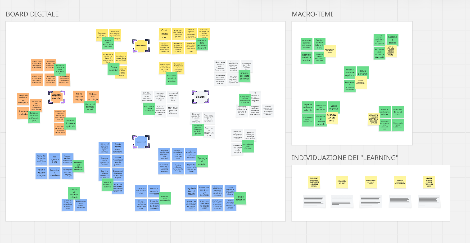 Gli insight sintetizzano i pattern emersi dalle interviste, mettendo in evidenza comportamenti ricorrenti, contraddizioni e bisogni latenti legati all’utilizzo dei servizi Buy Now, Pay Later.