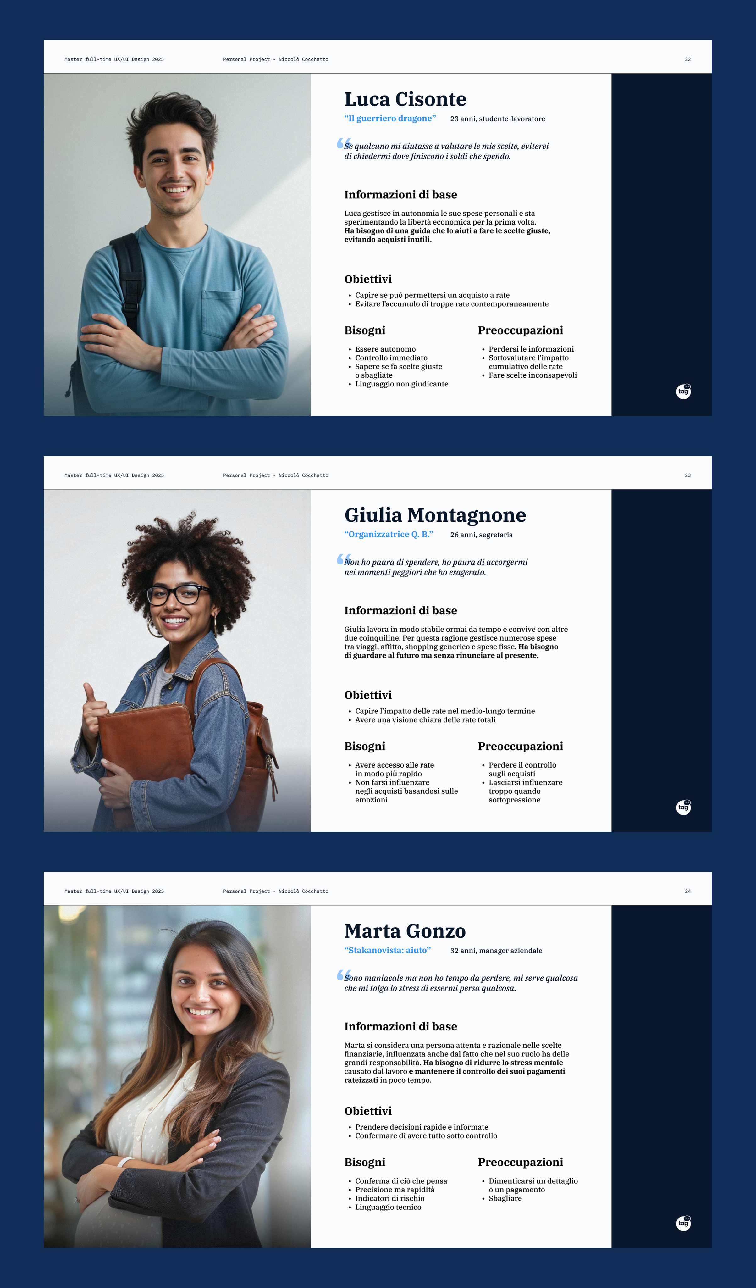 In questa fase ho sintetizzato esigenze, motivazioni e comportamenti di tre diverse tipologie di utente, con l’obiettivo di fornire una guida chiara alla progettazione nelle fasi successive.