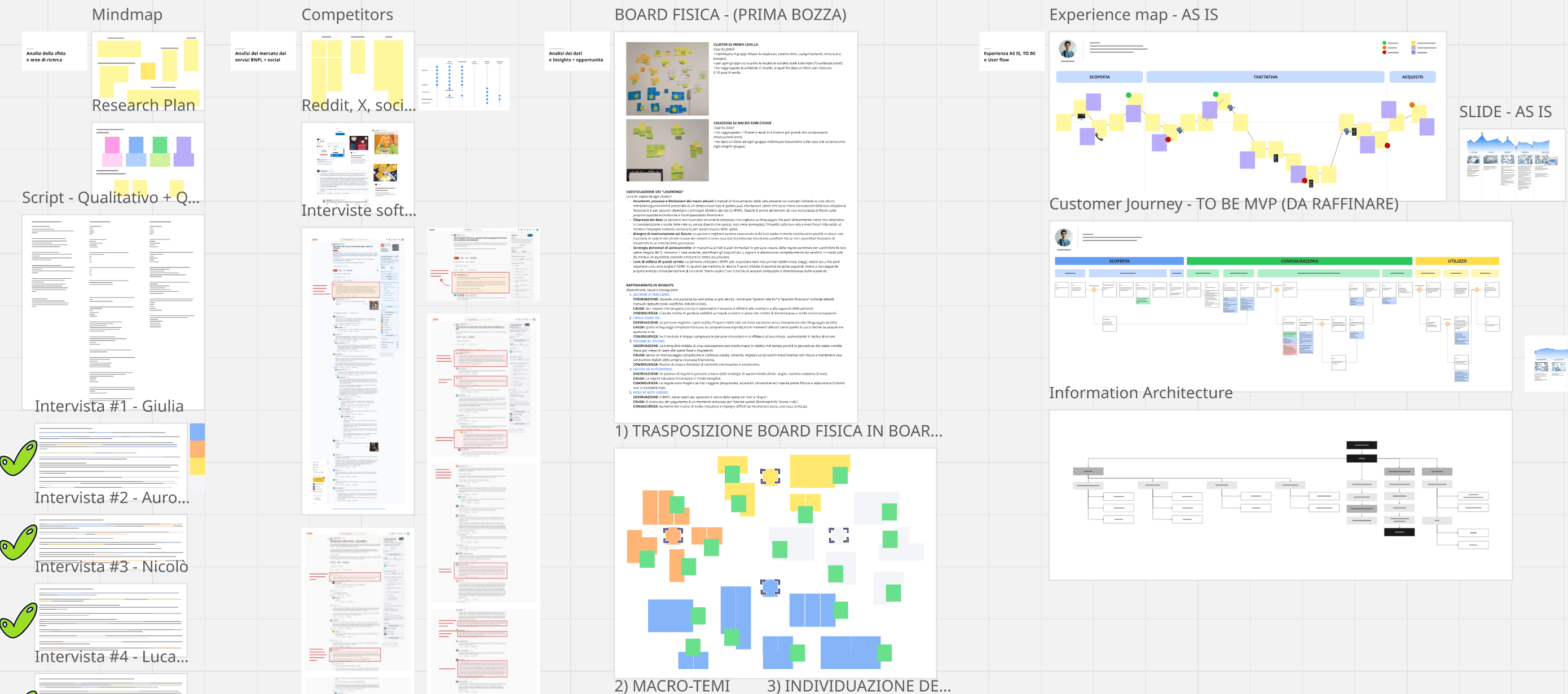 La fase di conduzione delle interviste è stata la più rilevante del progetto, poiché ha permesso di porre solide basi per una progettazione efficace. Questa attività ha fatto emergere spunti inaspettati, inizialmente esplorati attraverso una board di post-it fisici e successivamente rielaborati in formato digitale.
