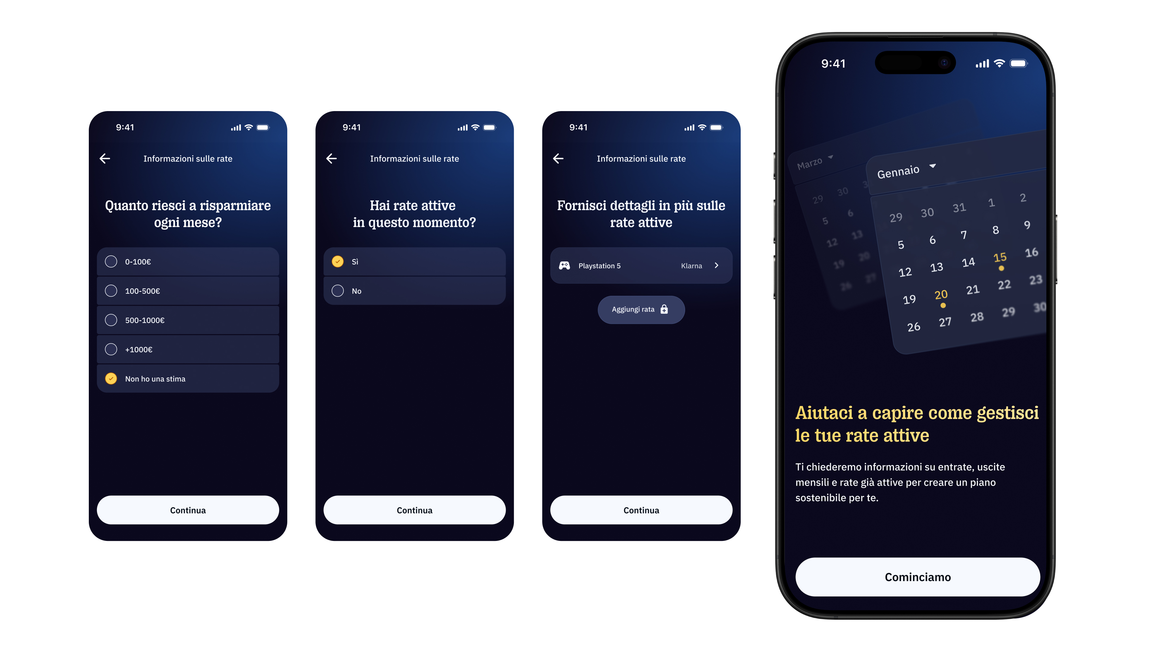 Successivamente l’utente compila un questionario volto a indagare le sue abitudini finanziarie e la gestione delle rate attive, così da fornire fin da subito all’applicazione i dati necessari per l’elaborazione del piano.