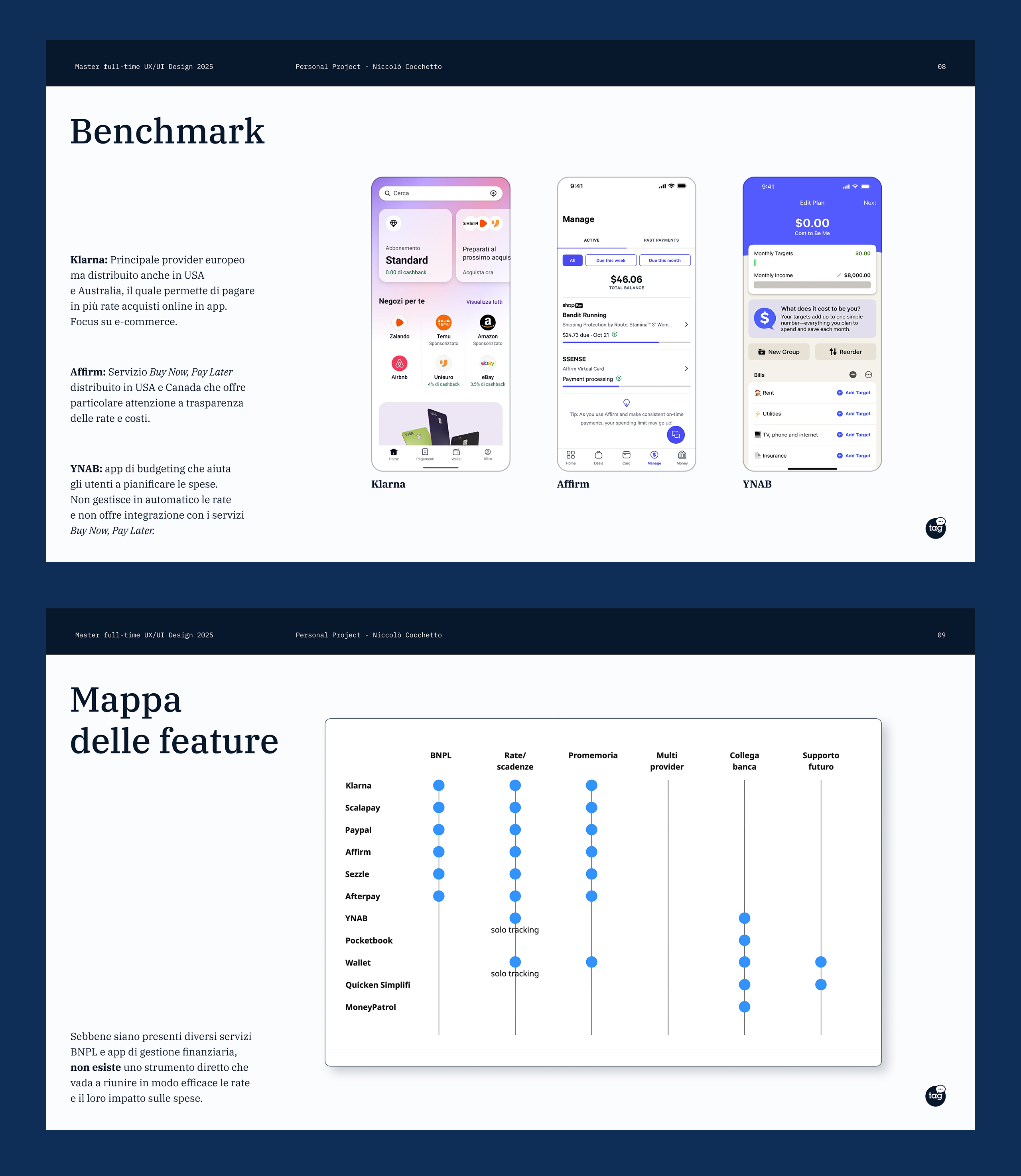 Durante l’intero progetto ho condotto un’analisi dei player presenti sul mercato, sia dal punto di vista dei fornitori di pagamenti a rate sia dei gestionali finanziari, valutandone punti di forza e debolezza.