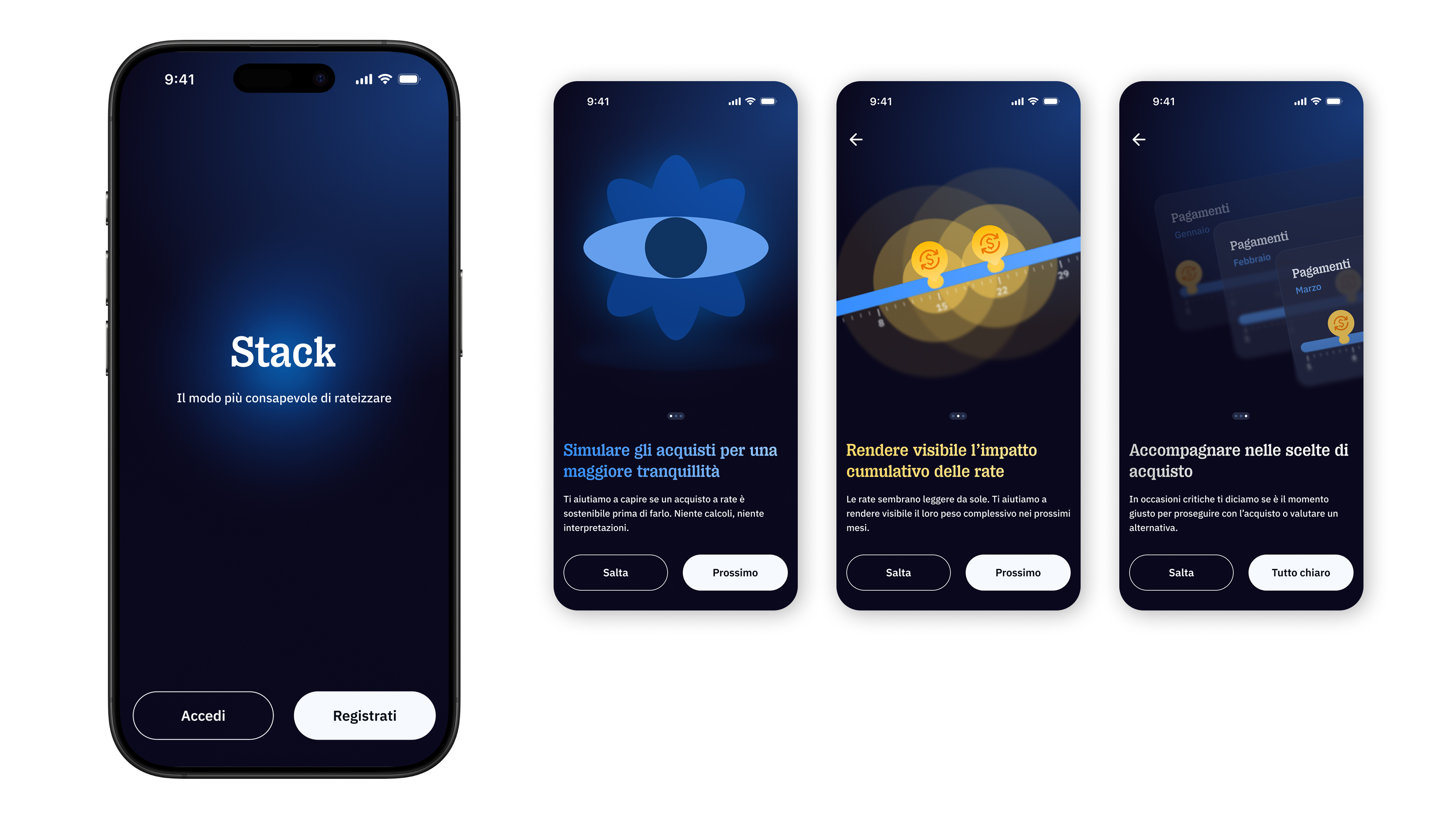 L’utente viene accolto da un’interfaccia che presenta le principali funzionalità di Stack, con l’obiettivo di rendere immediatamente chiaro cosa aspettarsi dall’applicazione.