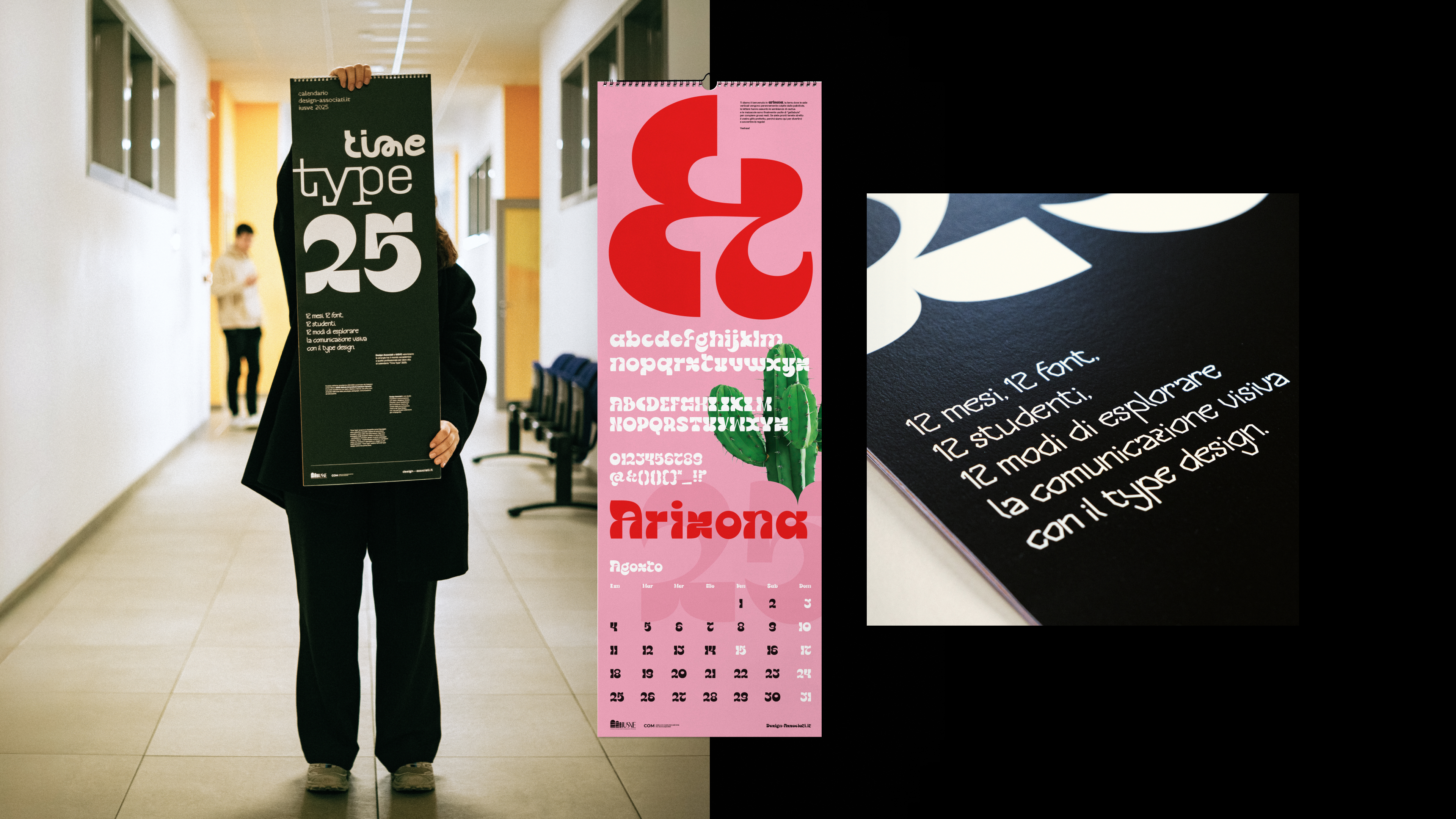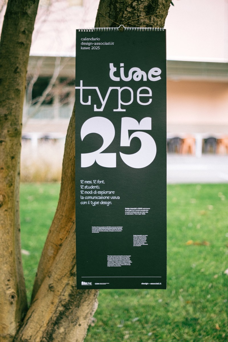 Nel 2024 all’interno dello studio Design-Associati abbiamo lanciato una collaborazione con l’università IUSVE di Venezia per la realizzazione di un calendario tipografico interamente realizzato da caratteri tipografici progettati dagli studenti. L’obiettivo era dare spazio al lavoro degli studenti e “pensare” in modo nuovo l’approccio al type design.
