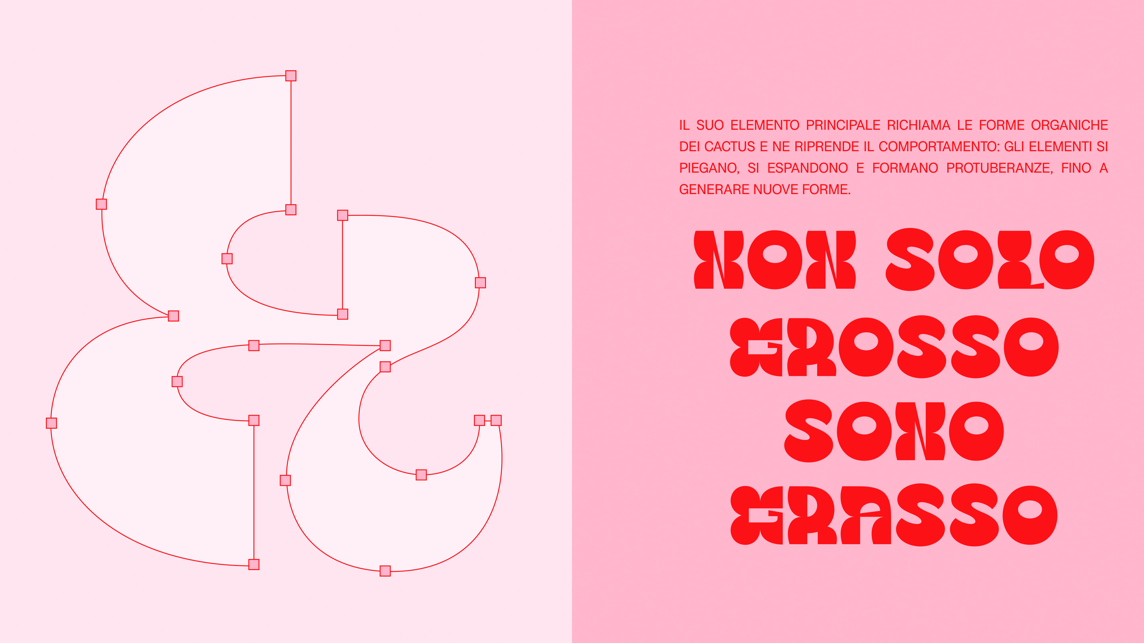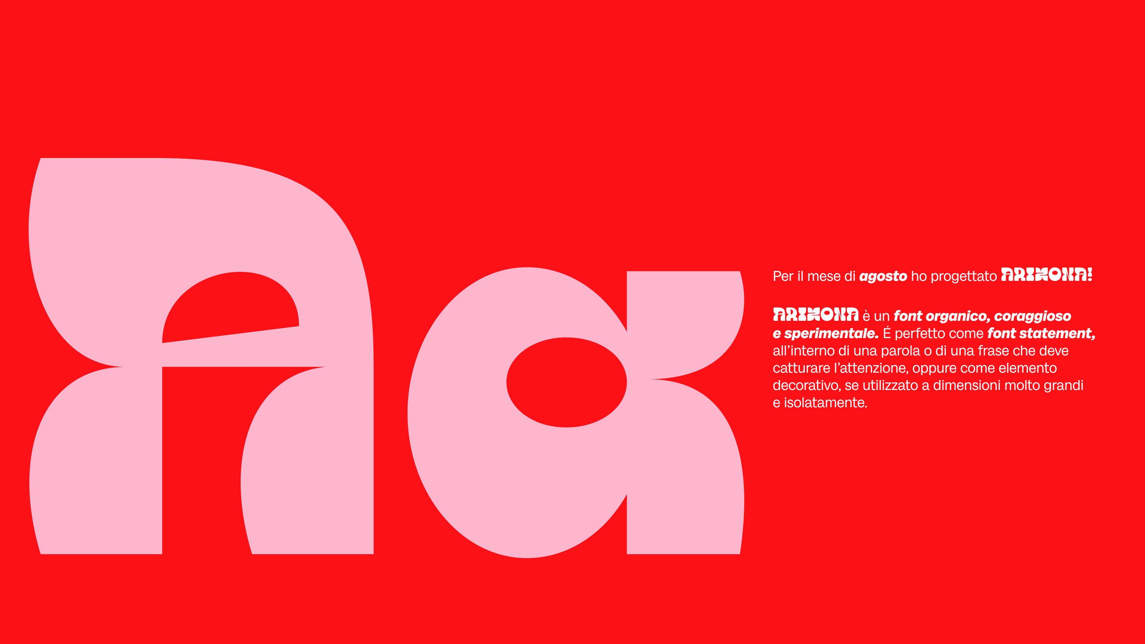 Arizona è un font organico, coraggioso e sperimentale. Esplora l’idea di giocare con le forme e le dimensioni dei caratteri, infrangendo, a tratti, le rigide regole classiche della tipografia.Arizona è perfetto come font Statement, all’interno di una parola o di una frase che deve catturare l’attenzione, oppure come elemento decorativo, se utilizzato a dimensioni molto grandi e isolatamente. Il suo elemento principale richiama le forme organiche dei cactus e ne riprende il comportamento: gli elementi si piegano, si espandono e formano protuberanze, fino a generare nuove forme.